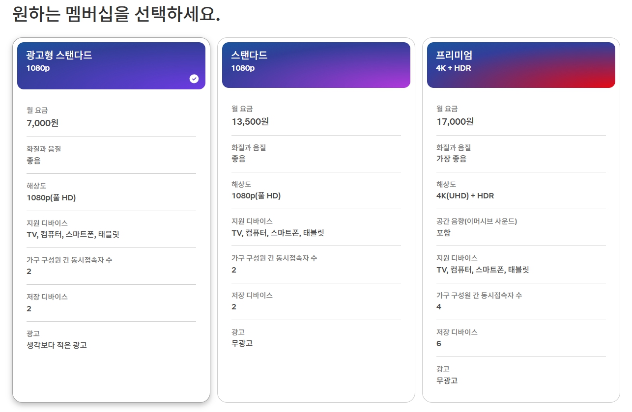 | 광고형(With Ads) | 7,000 | FHD(1080p) / 2명 | 광고 포함, 일부 콘텐츠 시청 불가 가능성 |